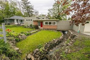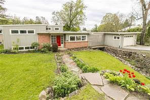 Here are some (fuzzy) exterior shots from the Realtor.ca listing showing what the house and front yard looked like in 2018. Lots of turf grass and creeping charlie in the lawn. The purple-ish pretty but prickly barberry bush by the front door was the first to go.