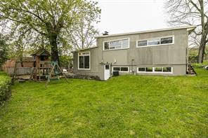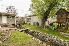 The creek flows through the backyard. Yes, we love the porch between the house and garage. The treehouse was gone when we took possession.